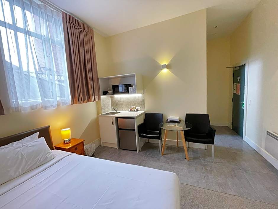 The room type offers a king-sized double bed, flat-screen TV, electric blanket, a kitchenette equipped with microwave/kettle/toaster, table/chairs, iron & iron board, wardrobe, pedestal fan or compact air cooler, complimentary toiletries and tea/coffee bags. It also includes a mini-bar with drinks and cookies.